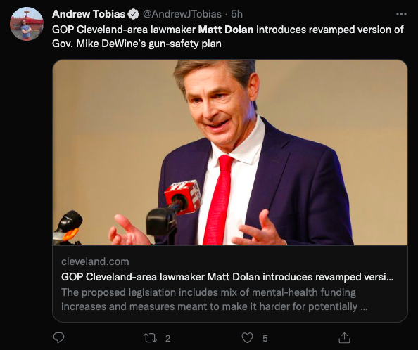 Cleveland Plain Dealer: “GOP Cleveland-area lawmaker Matt Dolan introduces revamped version of Gov. Mike DeWine’s gun-safety plan”